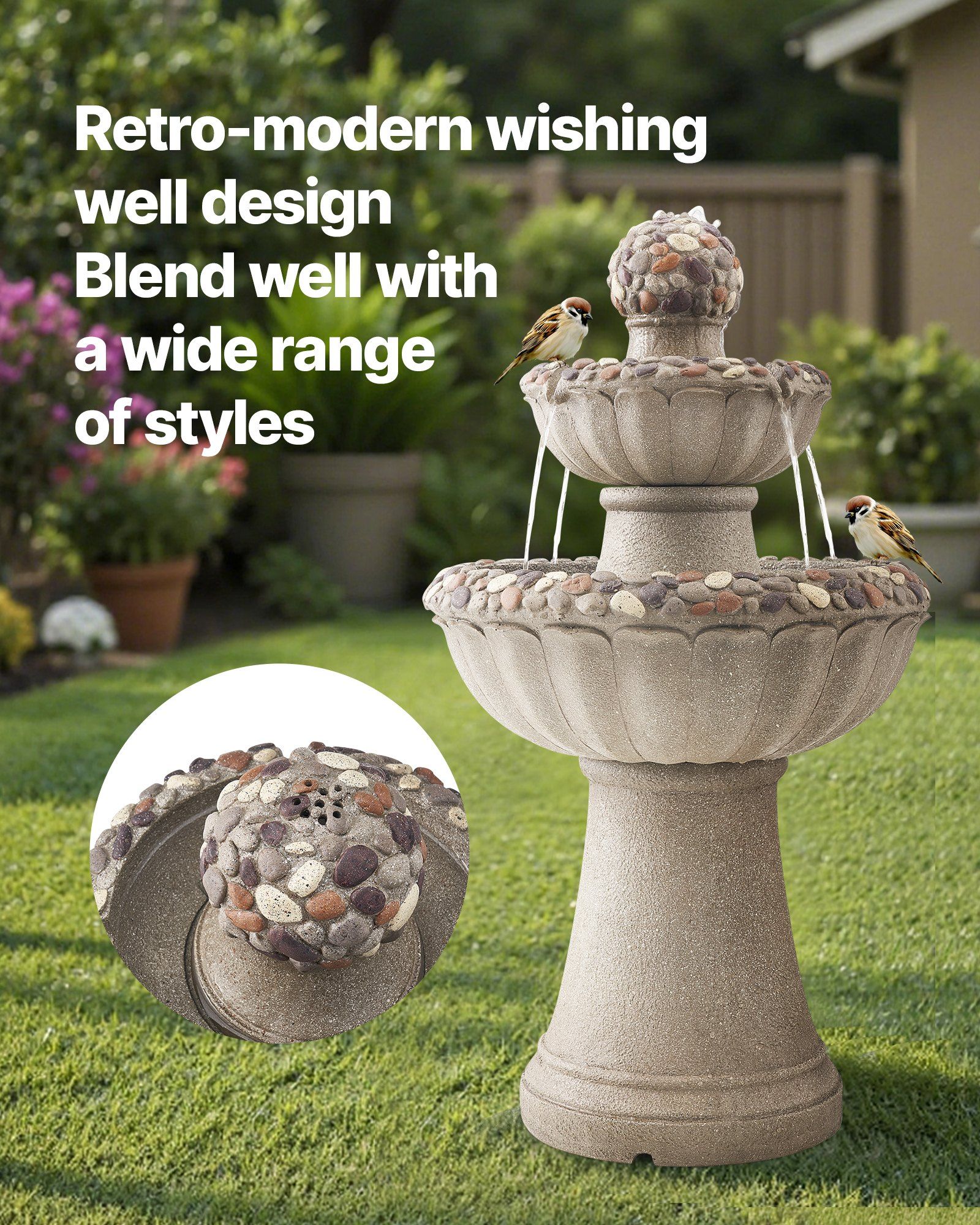 1.Classic and Simple Design: This outdoor water fountain features a modern-style base design that complements garden decor. Its timeless look adds elegance to your outdoor space, blending seamlessly into various environments